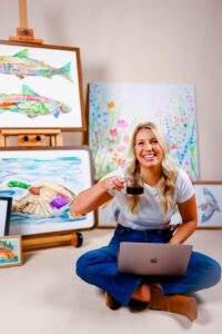 I am the artist attempting to teach you watercolor and acrylic painting here at Spruced Studio! For real though, teaching art kind of fell into my lap 6 years ago and I’ve been doing my best to fake it ever since 🙂 After years of searching for my “purpose,” I took a job teaching elementary art at a small private school; someone told me I was good at it one time.. so after searching for a way to do it on my own time, Spruced Studio was the perfect fit! I left teaching in the elementary school and now am a full time artist which includes teaching here at Spruced. I am self taught so self doubt goes hand in hand but I’d like to think that only makes my approach to teaching at Spruced better. If I can teach myself, surely I can teach you! I am married to my husband Brad and we have a cat named Rick! We love to spend time with friends and we have a mutual love for trying to find fun in every day. And that is why I’m teaching here! I have so much FUN seeing the joy and satisfaction that students creating art find in themselves. The community that brings people together in this studio is energetic and so meaningful. I love that it brings people who either want to learn new skills or just want to get together with friends- since that is exactly what art is to me, a way of finding myself and learning my strengths and a way of connecting with others. I hope that whatever class you take at Spruced, you’ll find yourself connecting with community, learning new skills and most importantly having fun. I love it here and I have faith you will too