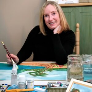 My company is called Fresh Decaf Watercolor. I've been teaching beginning watercolor at the studio since August 2023, a journey that began quite unexpectedly. I first discovered the joy of the medium while searching for an activity to share with my two granddaughters; however, I quickly found myself captivated by the process and became truly obsessed with the art form. As a self-taught artist, I developed my personal style by studying advanced techniques through various tutorials, a couple of classes and extensive practice.While attending one of Holly's sign painting classes with my two daughters and them excitingly announcing to Holly, "Our Mom does watercolor!", Holly invited me to bring in some samples and in turn join her teaching staff. It has been a pleasure to pass the techniques I've learned along to the students here at the studio. I truly enjoy seeing the beautiful outcomes, creative energy, laughter and the smiles shared around the tables.