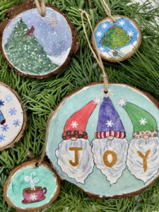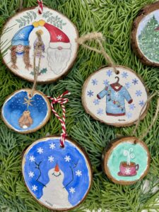 Join Theresa of Fresh Decaf Watercolor at Spruced Studio to paint cute whimsical scenes onto three different tree branch slices and add your choice of string for hanging.